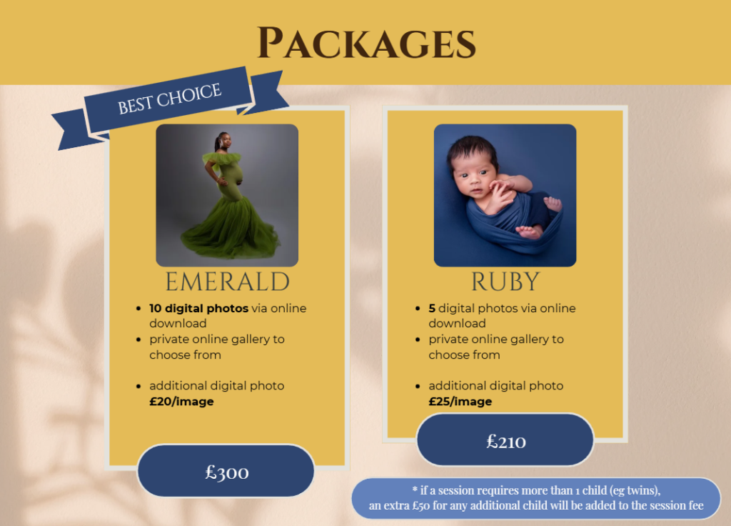 ✅ Styling (choose from over 50 outfits/gowns for women & maternity, and a large variety of props and clothes for newborns)